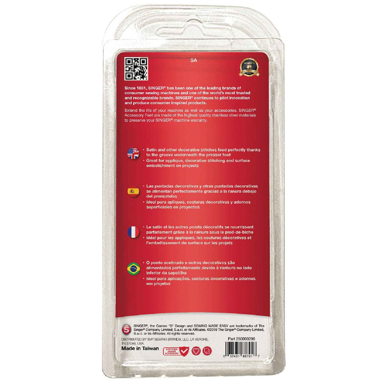 Satin and other decorative stitches feed perfectly thanks to the groove underneath the presser foot. Great for applique, decorative stitching and surface embellishment on projects.