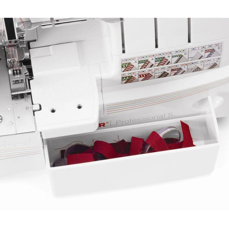 The Professional 5 serger saves you time because it sews a seam and seam finish at the same time, while trimming away the excess seam allowance. Seams and seam finishes – just like you see on store-bought garments – are possible thanks to the serger. You can use 2 threads, 3 threads, 4 threads or 5 threads for a wide variety of stitch combinations. You'll love the professional results this serger gives your projects. Comes with Coverstitch.