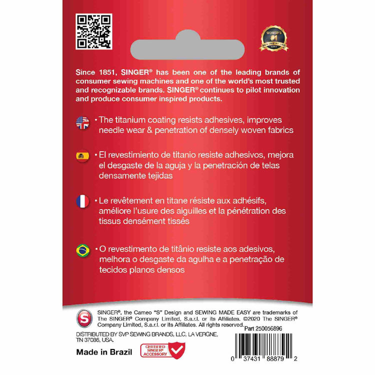 The titanium coating resists adhesives, improves needle wear & penetration of densely woven fabrics.