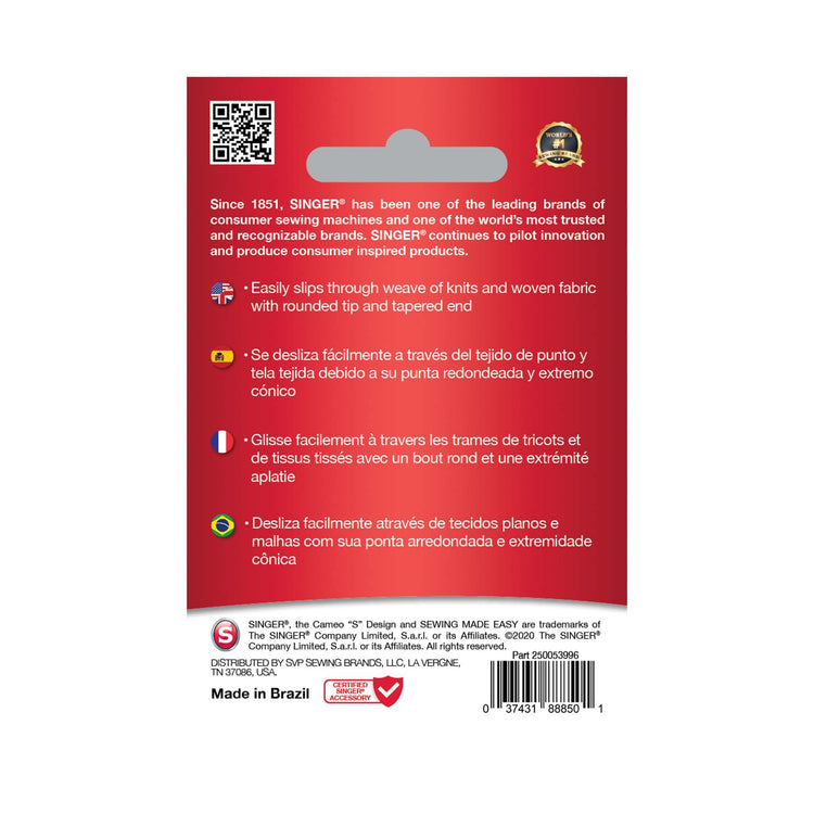 Easily slips through weave of knits and woven fabric with rounded tip and tapered end. For optimum performance, change your needle and/or type of fabric every 6 - 8 hours of sewing.