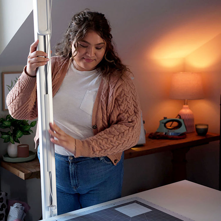 En la caja recibirás un proyector, una viga de montaje, una alfombrilla de corte de 36x24 pulgadas, un cortador giratorio, pesas de tela (4), pegatinas de objetivo de patrón, cable de alimentación y fundas para el cable.