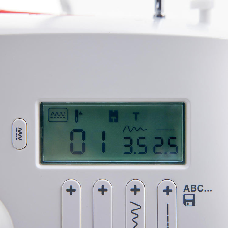 Pantalla LCD (+) - La pantalla LCD muestra claramente la puntada seleccionada, así como los ajustes de longitud y anchura de la puntada.