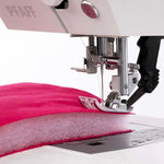 Muchos acolchadores utilizan una guía de bordes para coser hileras decorativas o rectas en su sándwich de acolchado, lo que garantiza que las líneas permanezcan perfectamente paralelas y evita que las capas se desplacen. Un pie móvil o el sistema IDT™/IDF ayudan a alimentar todas las capas de manera uniforme, reduciendo el desplazamiento de la tela. Una mesa de extensión proporciona un soporte adicional, minimizando el arrastre de la tela de la aguja mientras cose.