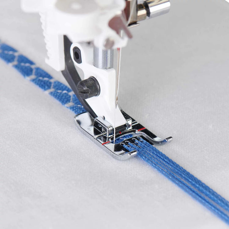 Create one-of-a-kind trims and stitch them in place in one step. Couch or stitch up to 7/11 decorative threads at once for quick embellishment using a decorative stitch or zigzag stitch wide enough to stitch over threads. Stabilize as needed.<br>