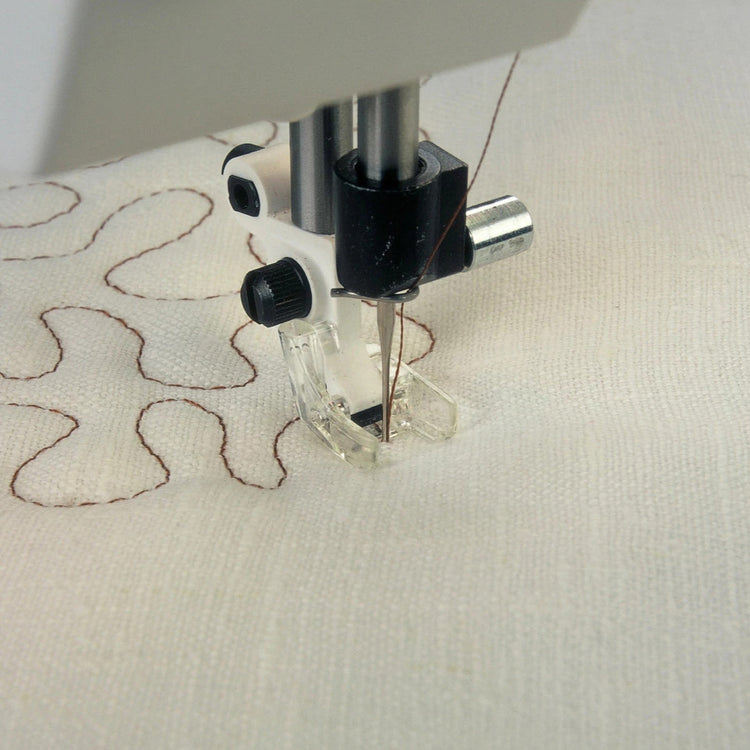 El prensatelas para costura de movimiento libre con puntera abierta es ideal para coser movimiento libre en telas estampadas, o al puntear alrededor de diseños recortados o bordados. Ofrece una visión clara para la costura de movimiento libre.