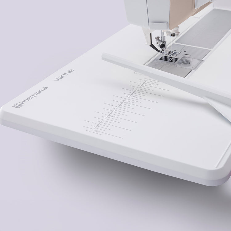 La guía ajustable con regla tiene tanto centímetros como pulgadas para que pueda coser dobladillos, bordes y mucho más con una precisión perfecta. La regla impresa en la tabla de extensión mide desde la aguja tanto en centímetros como en pulgadas para que siempre tenga a mano las medidas que necesita.