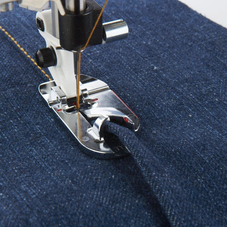 9 mm Las costuras planas, como las típicas de los vaqueros, son muy duraderas y populares. También se utilizan a menudo en artículos de decoración del hogar y añaden un toque decorativo cuando se cosen con un hilo de contraste. Los mejores resultados se obtienen con telas de peso medio o alto.