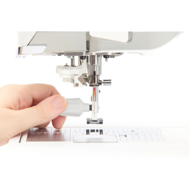 La multiherramienta HUSQVARNA® VIKING® tiene un destornillador magnético en un extremo y un soporte magnético único en el otro. Puede utilizarse para ayudar a sujetar e instalar el tornillo del tobillo del prensatelas.