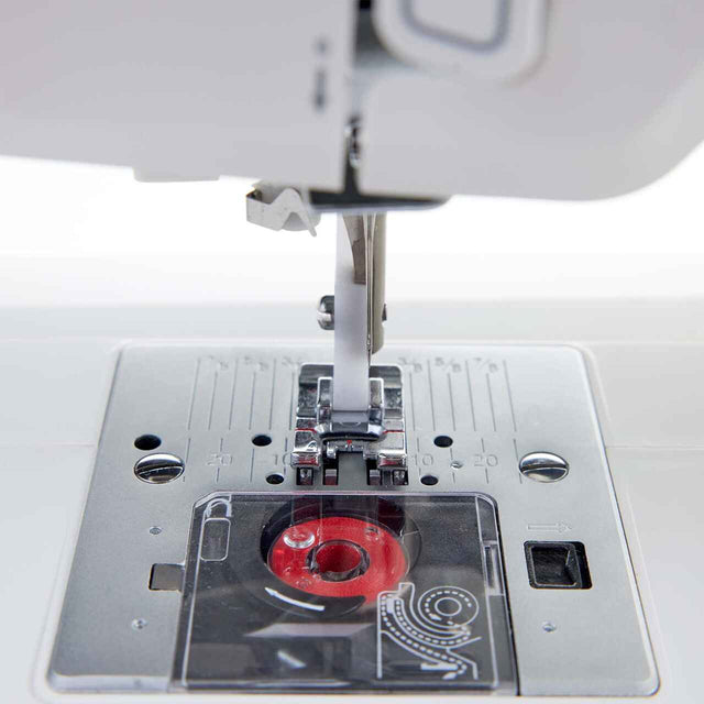 Sí, esta máquina está equipada con un cómodo sistema de bobina superior, que es fácil de cargar y le permite controlar fácilmente el suministro de hilo de la bobina a través de una cubierta transparente.