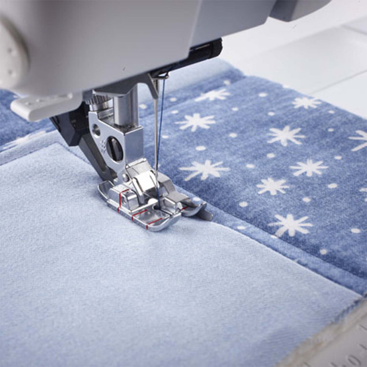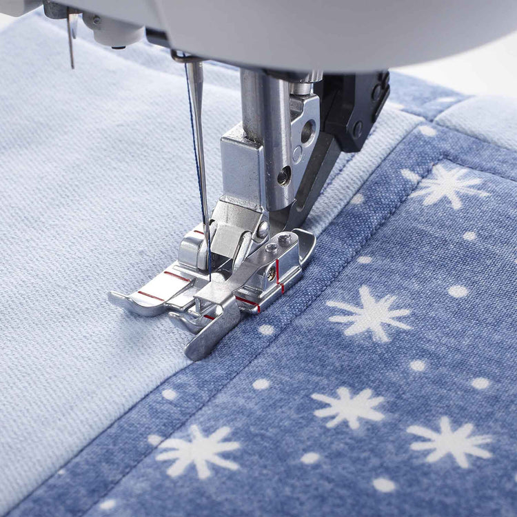 4. Coloque el acolchado bajo el prensatelas con la guía del reborde en la zanja de costura o en el borde del bloque de tela.
