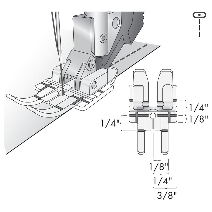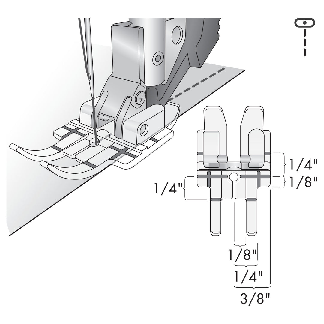 Este prensatelas para acolchar es ideal para unir piezas de tela porque ofrece una visibilidad clara al coser costuras de 1/4", 1/8" y 3/8". Las líneas rojas indican los puntos de giro de 1/4" delante y detrás de la aguja.