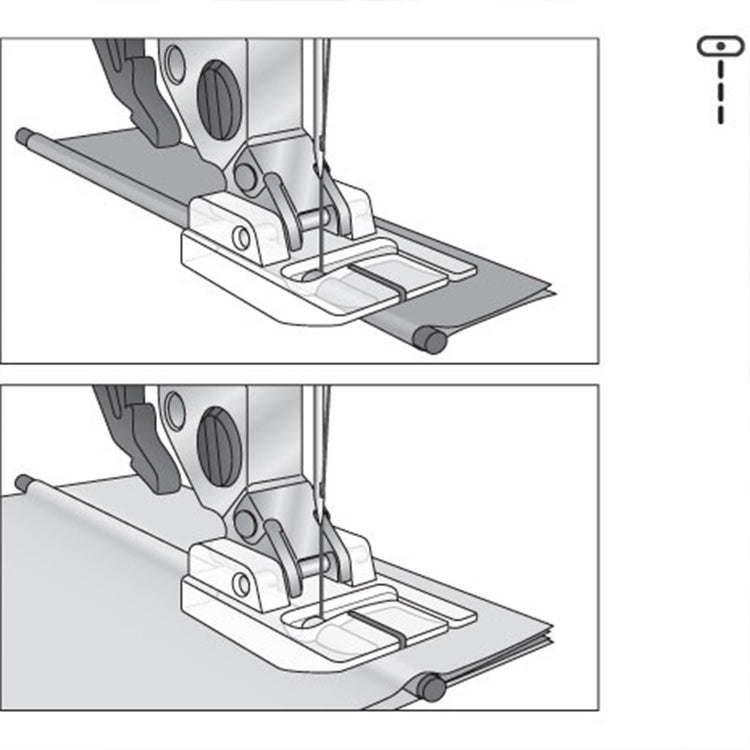 4. Coloque la tela y el cordón bajo el pie prénsatelas para ribetear con el cordón en la ranura de la parte inferior del pie prénsatelas.
