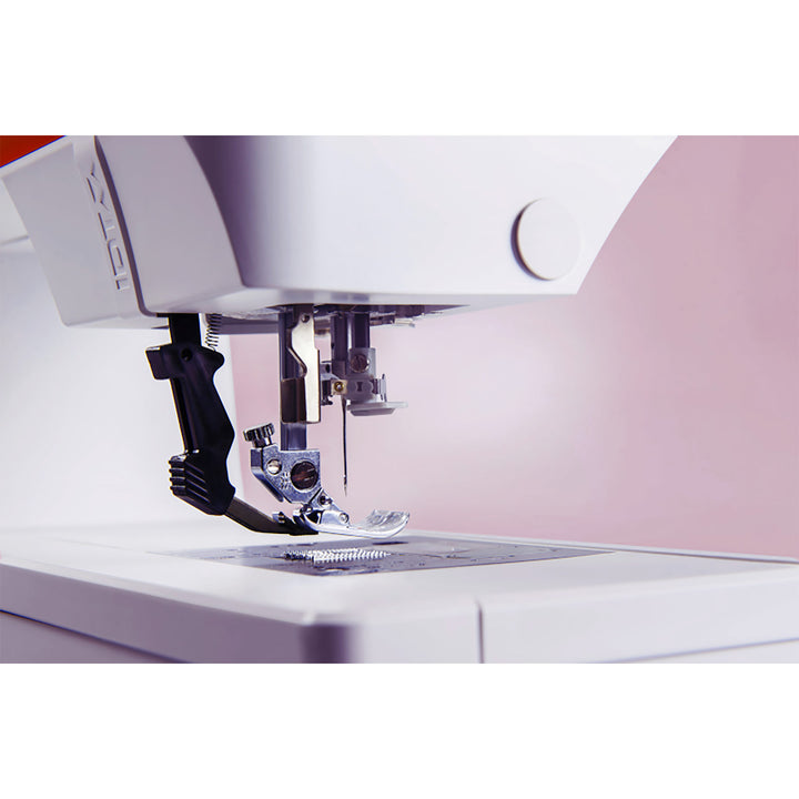 La iluminación brillante y uniforme diseñada por expertos en optrónica muestra el color real del tejido y limita las sombras en los proyectos. El alto poder de perforación de la aguja (150NWT) facilita la costura de materiales pesados. La placa base de la máquina está diseñada para reducir las vibraciones y aumentar la estabilidad.