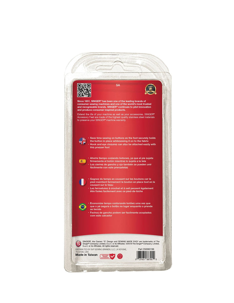 Ahorre tiempo cosiendo botones, ya que el prensatelas sujeta firmemente el botón mientras lo cose en la tela. Los cierres de corchete también pueden fijarse fácilmente con este prensatelas.