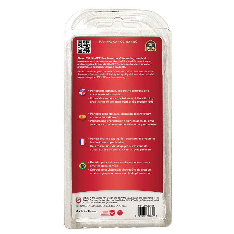 El prensatelas para puntera abierta es útil cuando se aplican cintas, hilos o ribetes a superficies de tela. El pie le permite guiar fácilmente el ribete mientras cose gracias a la generosa zona de visión y a la ranura situada debajo del pie. Puede marcar una marca de guía en el lado derecho (parte superior) de la tela. Coloque una capa de estabilizador debajo de la tela. Esto puede ayudar a evitar que la tela se frunza al coser. Seleccione una puntada decorativa o una puntada en zigzag y ajuste el ancho de la puntada lo suficientemente ancho como para cubrir la cinta. Pase la cinta por debajo del prensatelas para aplicarla a la tela y empiece a coser. Puede variar las puntadas decorativas utilizadas en el mismo proyecto para obtener combinaciones únicas.