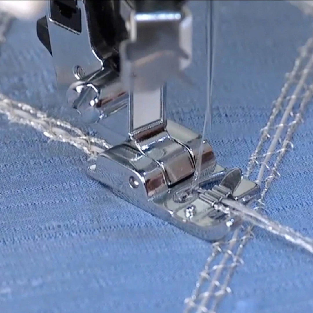 El prensatelas para cordón se utiliza principalmente para añadir adornos superficiales a las telas, pero también tiene algunos usos prácticos. Este prensatelas tiene una guía ranurada en la parte superior que sujeta hasta tres hilos o cordones ligeros separados. El pie sujeta los cordones mientras usted los cose a la tela. Puede utilizar uno... dos... o los tres agujeros, según el efecto que desee. Se divertirá experimentando con diferentes puntadas decorativas y combinaciones de cordones.