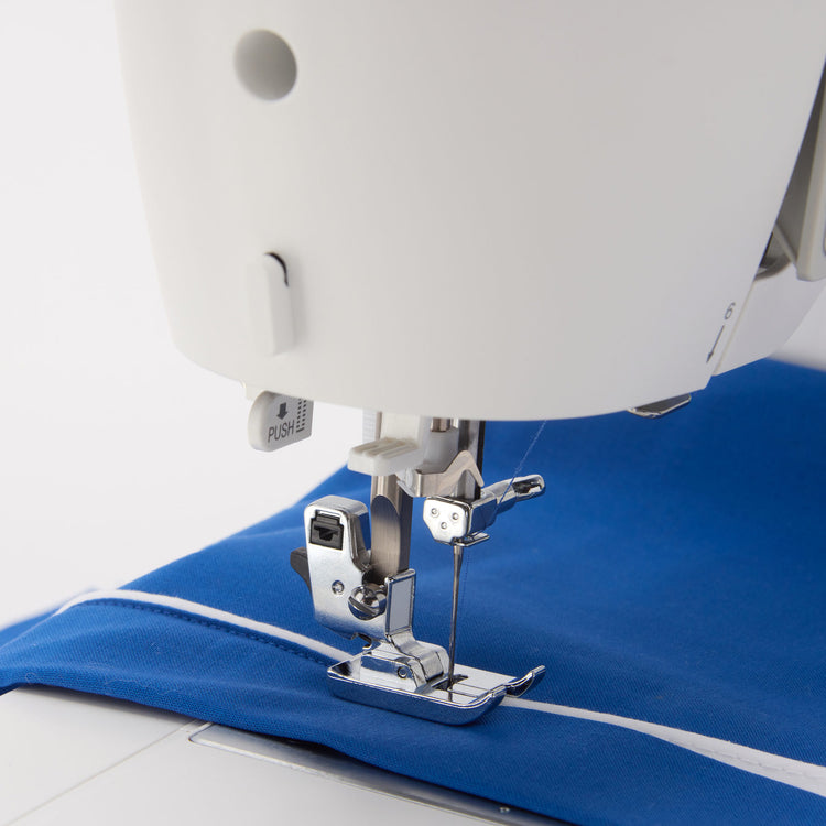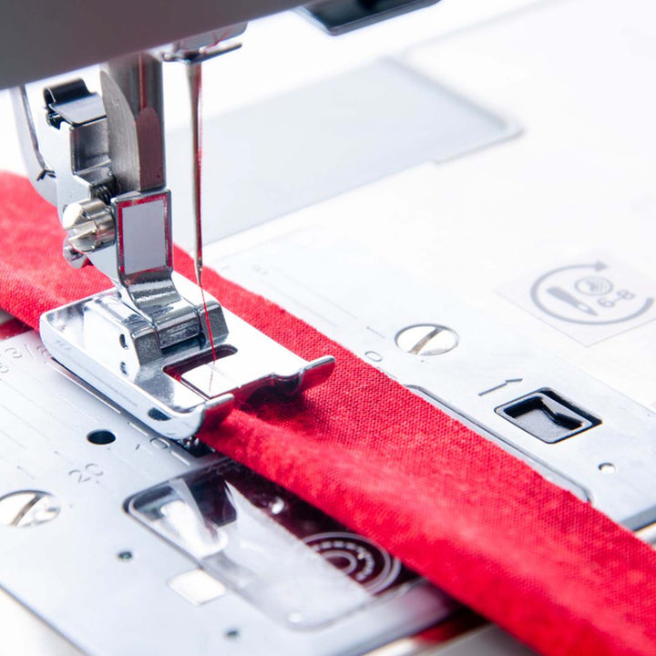 El pie prénsatelas para ribetear se utiliza para insertar ribete empaquetado en costuras y bordes para un acabado a medida. Para ribetes especiales, el cordón puede cubrirse con tela. La vista clara le permite ver su costura y la colocación del ribete y ver la primera hilera de costura y ajustar la posición de la aguja adecuadamente para coser junto a la hilera original.