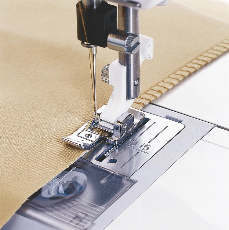 The J Foot is used for overcast stitches that stitch to the side and can pucker or curl the fabric to prevent the fabric from curling under. The tiny wire on the edge of the foot prevents the curling of the fabric edge. Consult the HUSQVARNA® VIKING® machine display which recommends the J Foot for many overedge stitches.