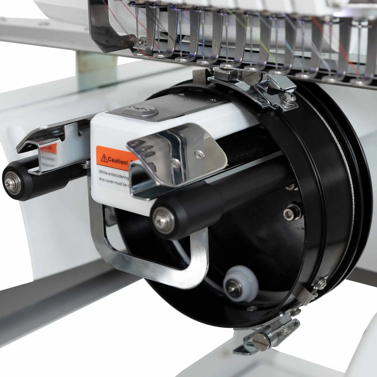 The 220° wide angle cap system allows users to embroider around any cap with ease. Plus, your PLATINUMTM MN|1000 multi-needle embroidery machine will automatically flip your design 180° whenever the cap driver is attached.
