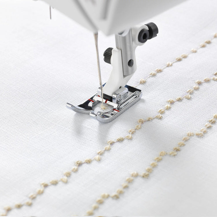Sew beautiful heirloom candlewicking techniques! The foot has a deep tunnel on the underside to feed over built-up stitching.