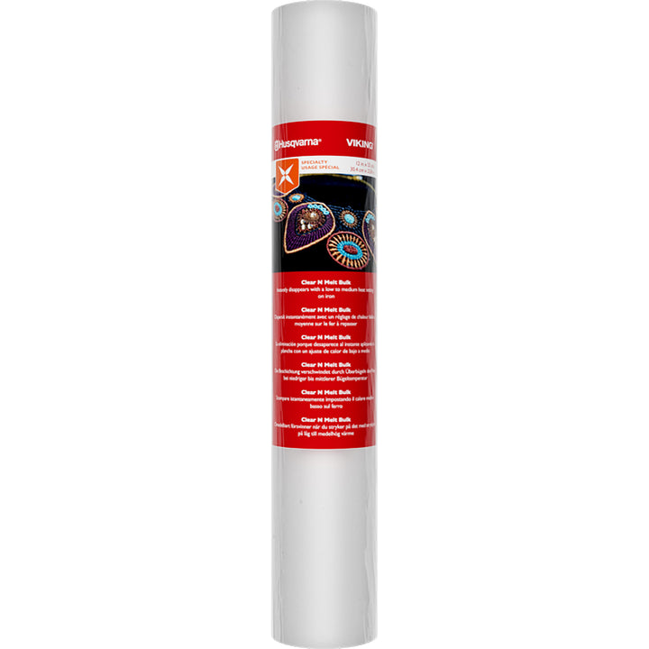 Husqvarna® Viking® Clear N’ Melt is a revolutionary advancement in film topping and backing. This film eliminates the use of water for removal because it instantly disappears with a low to medium heat setting on iron. Husqvarna® Viking® Clear N’ Melt does not stick to irons, ironing board covers, or items being ironed. Can be used as either a topping or backing on stable fabrics.
