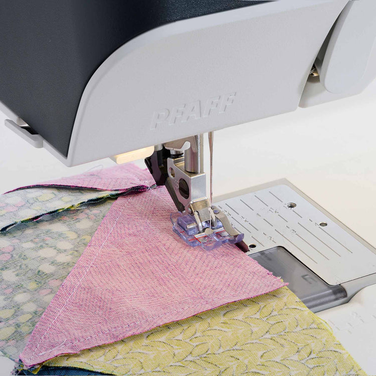 Note: With any of the 1/4" Right Guide Feet with IDT™ system attached to machines with manual presser foot lift, we recommend not lifting the presser foot to the extra high position. This can cause the needle threader to touch the guide on the presser feet. With the needle set to down position, we recommend lifting the presser foot only as much as needed while pivoting so that the fabric can be turned freely.