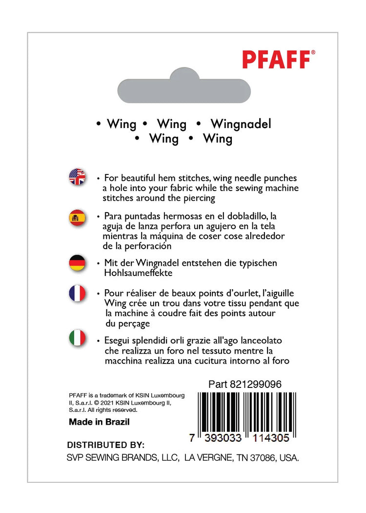For beautiful hem stitches, a wing needle punches a hole into your fabric, while the sewing machine stitches around the piercing. For optimum performance, change your needle every 6 - 8 hours of sewing and/or type of fabric.