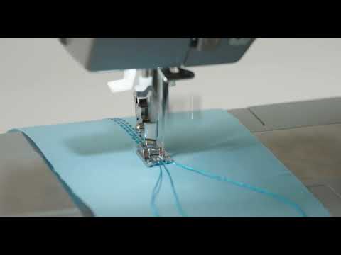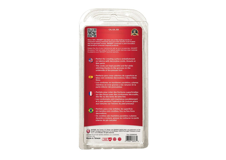 The Cording Foot is mainly used to add surface embellishment to fabrics, but it has some practical uses, too. This foot has a slotted guide on the top which holds up to three separate lightweight yarns or cords. The cords are held by the foot, while you stitch them to the fabric. You can use one…two…or all three holes, depending on the effect you want. You’ll have fun experimenting with different decorative stitches and combinations of cords!