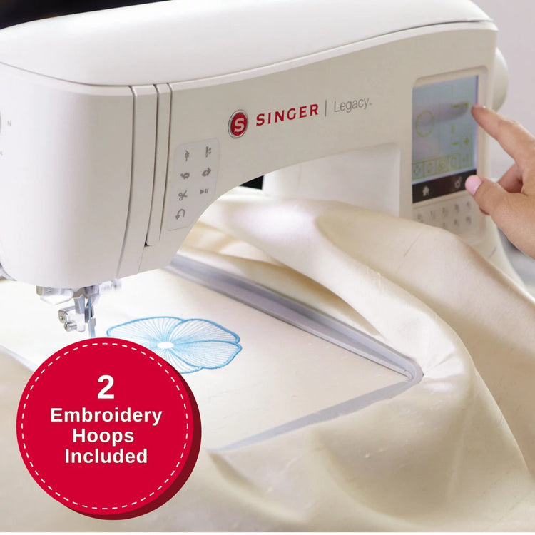 The SINGER Legacy SE300 includes two embroidery hoops: a large 10.25" x 6" hoop and a small 4" x 4" hoop, providing versatility for various project sizes.