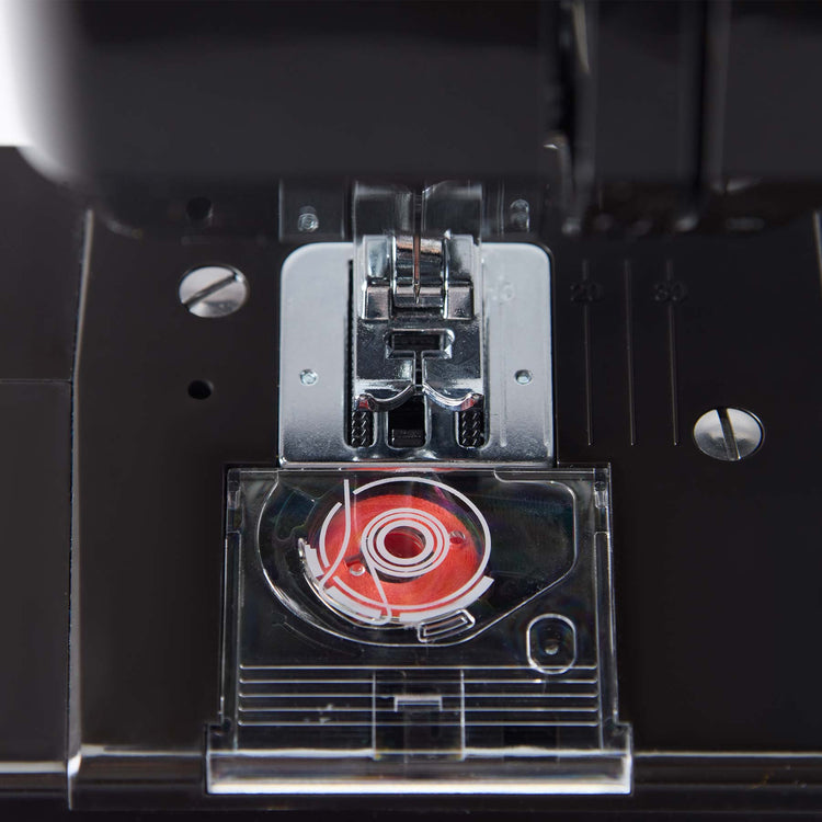 Top Drop In Bobbin (+) - Easy to thread and easy to see! The transparent bobbin and cover allow you to monitor your thread supply so you don't run out of thread in the middle of a seam.