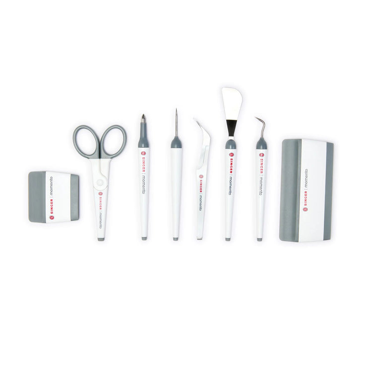Includes all the essential tools to use with your Singer Momento Craft Cutting Machine. Included in the set are scissors, 3 inch scraper, 5 inch scraper, spatula, angled weeding tool, straight weeding tool, tweezers, scoring stylus.