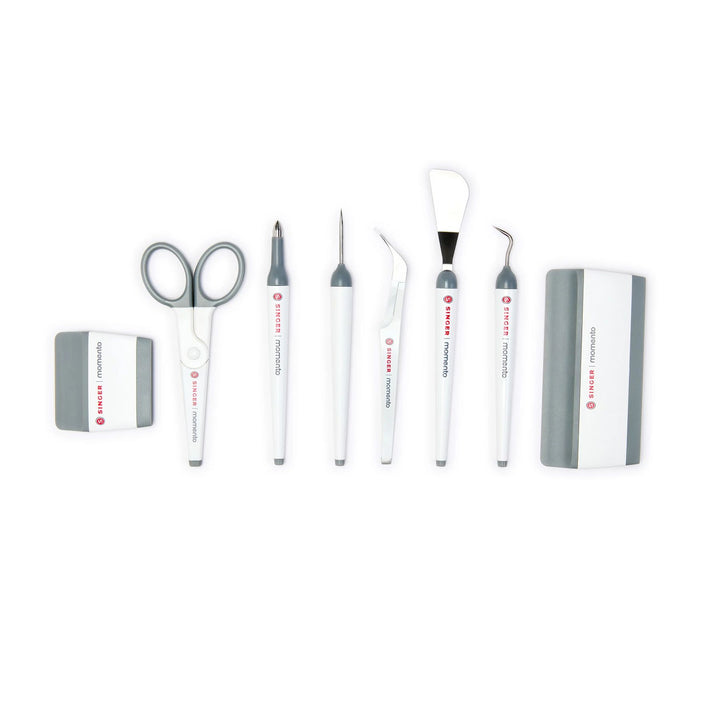Includes all the essential tools to use with your Singer Momento Craft Cutting Machine.  Included in the set are scissors, 3 inch scraper, 5 inch scraper, spatula, angled weeding tool, straight weeding tool, tweezers, scoring stylus.