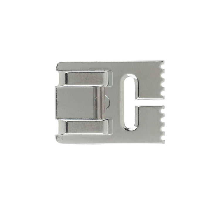The Pintuck Foot is used for embellishing garments, table linens and bed linens, typically in conjunction with a twin needle (not included). Working with a twin needle, the foot creates evenly spaced raised tucks in the fabric. It has a series of evenly- paced grooves on the underside which allows for perfectly parallel rows of raised tucks that will not be flattened when sewn.