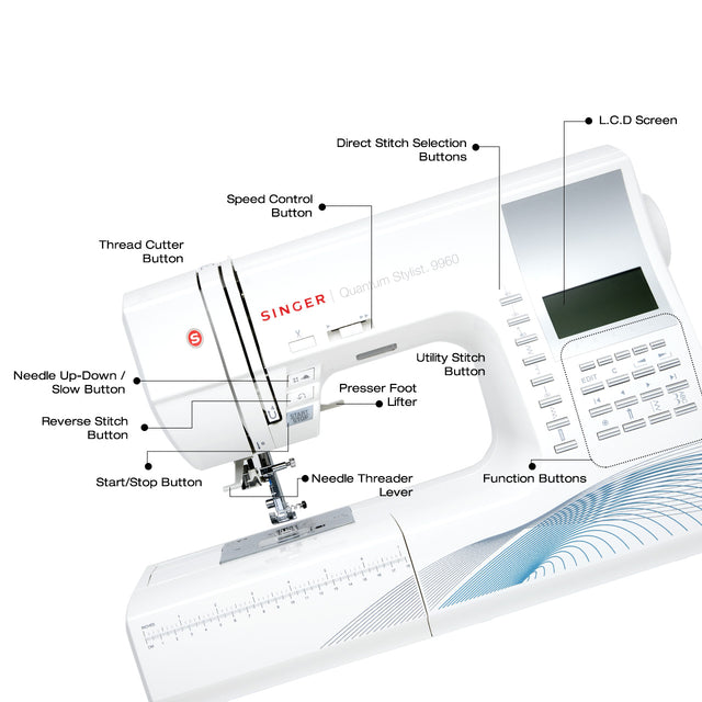 The SINGER Quantum Stylist 9960 is a computerized sewing machine packed with 600 built-in stitches, including 5 alphanumeric fonts and 13 automatic 1-step buttonholes, for endless creativity.